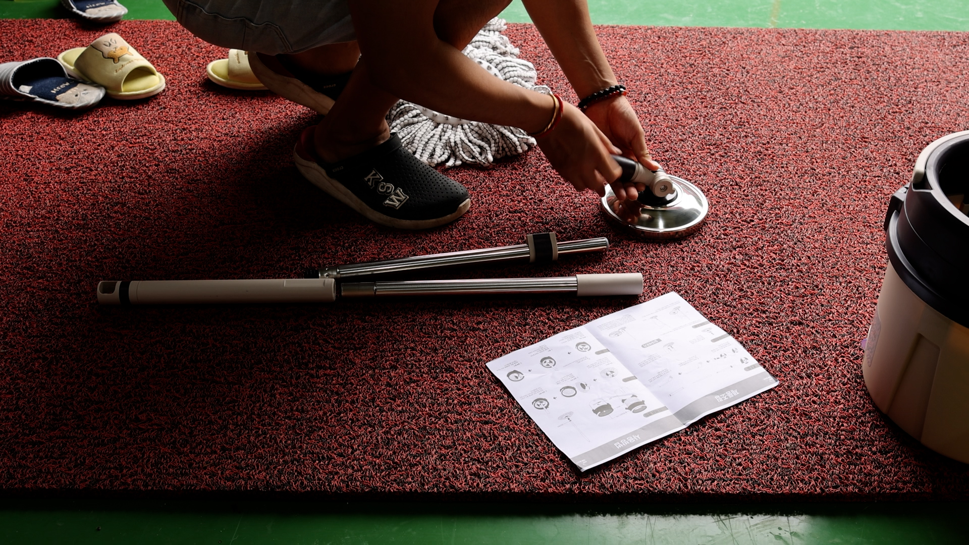 원판과 3단으로 구성된 마포걸레 봉을 차례로 연결해주면 된다.